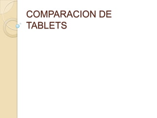 El documento compara las características de varias tablets, incluyendo el iPad de Apple, la Asus, la Sony Tablet S, la Samsung Galaxy Tab y la Barnes & Noble Nook. Describe las especificaciones clave de cada tableta como el tamaño de pantalla, procesador, memoria, sistema operativo, batería y peso.