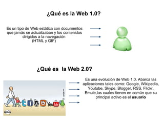 La Web 1.0 era estática con documentos que no se actualizaban y contenidos para navegación como HTML y GIF. La Web 2.0 es una evolución que incluye aplicaciones interactivas como Google, Wikipedia y YouTube donde los usuarios interactúan y comparten contenido, y el valor del sitio aumenta con más usuarios. Mientras la Web 1.0 consideraba a los usuarios como espectadores pasivos, la Web 2.0 les permite producir y compartir contenido personal.