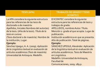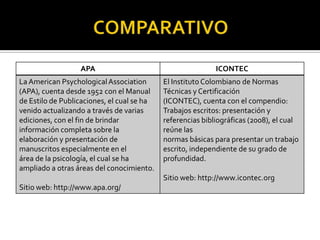 Este documento compara las normas APA e ICONTEC para citas y referencias bibliográficas. Describe las diferencias entre ambas normas en el uso de notas a pie de página, citas directas, paráfrasis y citas de citas. También explica cómo cada norma trata las referencias a artículos de revista y libros.