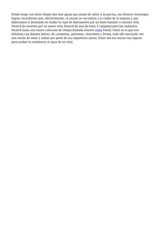 El documento analiza la importancia de los relojes como complementos esenciales en la moda, destacando la tecnología y el diseño de marcas como Edox y Swatch. Se menciona la evolución de los relojes sumergibles y la introducción de nuevas colecciones inspiradas en la creatividad y el verano, así como el reconocimiento internacional de innovaciones en el diseño de relojes. Además, se enfatiza la habilidad de ciertos relojes para permitir a los usuarios disfrutar del tiempo sin restricciones.