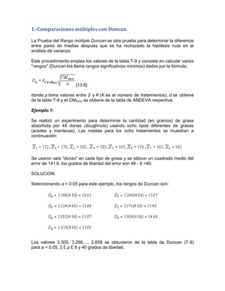 El documento presenta una comparación de diferentes métodos estadísticos para comparar promedios, incluyendo las pruebas de Duncan, Tukey, Dunnett, Scheffé y Newman-Keuls. Explica cada método a través de ejemplos numéricos, describiendo cómo calcular los rangos significativos y determinar si hay diferencias significativas entre los promedios.