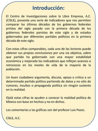 El documento presenta una serie de indicadores económicos y sociales en México, comparando las décadas de gobiernos priístas y panistas. Se analizan datos sobre crecimiento del PIB, inflación, devaluación del peso, déficit presupuestal, salarios, deuda externa y más, para ayudar a los ciudadanos a entender la realidad política y económica del país. A través de estos datos, se busca fomentar un debate fundamentado en hechos y no en rumores.