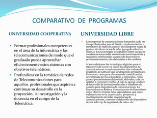 El resumen compara los objetivos de dos programas universitarios. El programa de la Universidad Cooperativa busca formar profesionales capaces de interpretar y aplicar tecnologías asociadas a redes de datos, aplicar y diseñar sistemas de transmisión de datos usando diferentes medios, y administrar redes de computadoras eficientemente. El programa de la Universidad Libre tiene como objetivo formar profesionales competentes en informática y telecomunicaciones para que puedan aprovechar sistemas telemáticos y profundizar en temas de redes de telecomunic