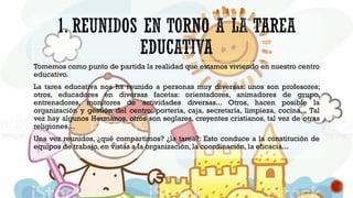 El documento aborda la realidad educativa en un centro que incluye una diversidad de roles y la importancia de la misión eclesial en la educación lasaliana. Se enfatiza la necesidad de centrarse en la persona del alumno y no solo en las tareas educativas, promoviendo la comunión y el carisma lasaliano. Además, se menciona la figura de Juan Bautista de La Salle como un fundador cuya misión responde a las necesidades de los abandonados y empobrecidos a la luz de la fe.
