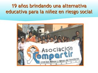 Compartir Honduras es una organización sin fines de lucro fundada en 1991 que brinda apoyo educativo y de prevención a aproximadamente 3,000 niños y niñas en riesgo social en 3 barrios de Tegucigalpa, Honduras. La organización ofrece programas de educación formal y no formal, participación comunitaria, integración social, y padrinazgo para mejorar las condiciones de vida de los niños y sus familias.