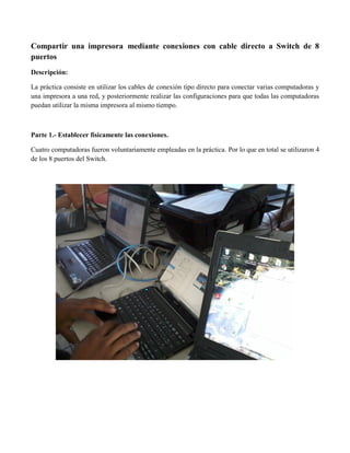 Este documento describe cómo compartir una impresora entre varias computadoras conectadas a un switch de 8 puertos mediante cables directos. Se conectaron 4 computadoras y una impresora al switch. Se configuró el grupo de trabajo y las direcciones IP de los equipos para que pudieran identificarse y compartir recursos en la red, incluyendo la impresora. Finalmente, se comprobó que cualquier computadora podía enviar trabajos de impresión a la impresora compartida.