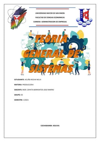 Este documento presenta una introducción a la teoría general de sistemas. Explica que la teoría estudia los principios aplicables a sistemas en cualquier nivel e incluye conceptos como autopoiesis y retroalimentación. Señala que la teoría surgió en la biología pero se expandió a otras disciplinas. Finalmente, resume los orígenes y desarrollo de la teoría general de sistemas desde su formulación por Ludwig von Bertalanffy en 1950.