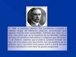 Karl Landsteiner descubrió en 1900 que la sangre podía ser de diferentes tipos (A, B, AB y O) dependiendo de la presencia o ausencia de proteínas en los glóbulos rojos. Observó que algunas mezclas de sangre eran compatibles mientras que otras no y causaban reacciones. Esto llevó al establecimiento del sistema de grupos sanguíneos.