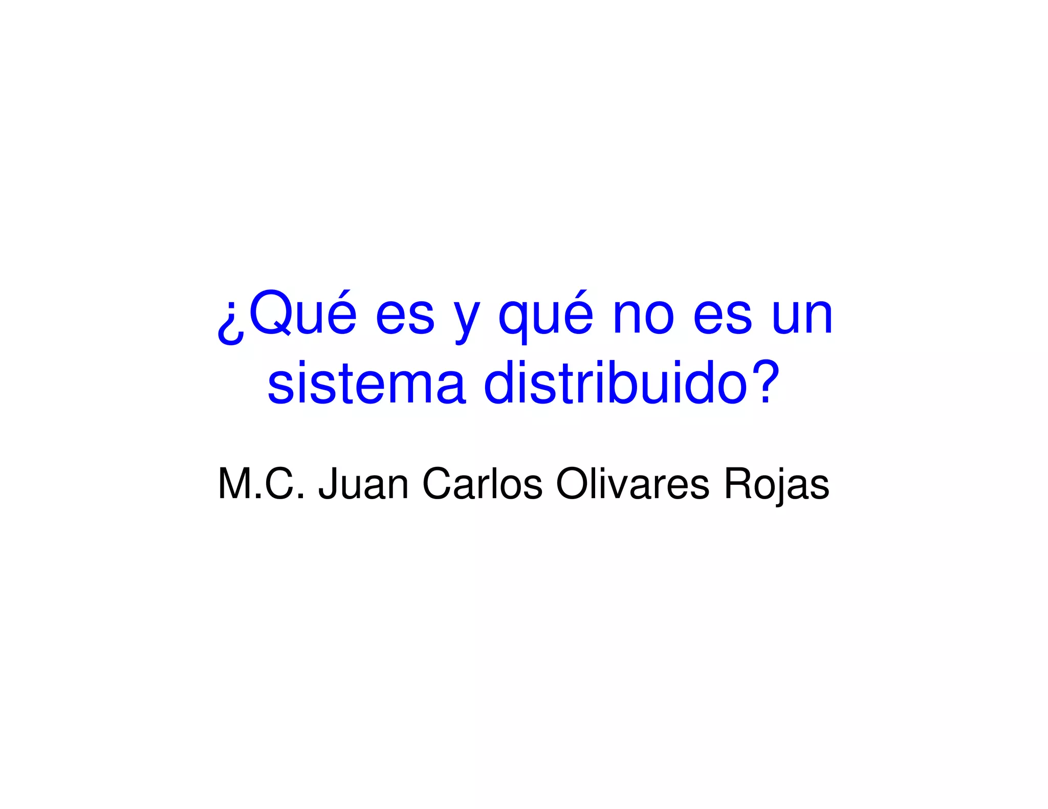 Este documento define qué es y qué no es un sistema distribuido. Explica que un sistema distribuido es una colección de computadoras independientes que parecen una sola computadora para los usuarios, y que el objetivo es descentralizar el cómputo para lograr mayor eficacia y tolerancia a fallos. También discute que algunas tecnologías como cómputo paralelo no son sistemas distribuidos en sí mismas, a menos que estén implementadas de manera distribuida a través de una red. Finalmente, concluye que los sistemas distribuidos