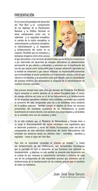 Este documento presenta un resumen de las principales leyes y decretos leyes relacionados con los hidrocarburos en Bolivia desde 1900 hasta diciembre de 2012. Entre los aspectos más destacados se encuentran la nacionalización de los hidrocarburos en 2006, la constitución de 2009 que establece la política estatal sobre hidrocarburos, y leyes recientes que aprueban contratos de servicios petroleros entre YPFB y otras empresas para la exploración y explotación de diferentes áreas. El documento provee una referencia de la legislación histó