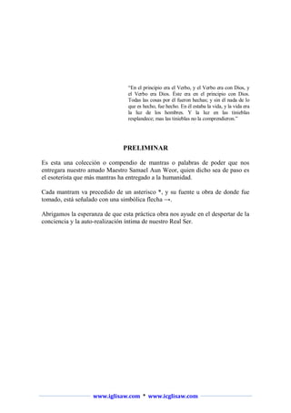 Este documento presenta una colección de mantras o palabras de poder provistos por el maestro espiritual Samael Aun Weor. Cada mantra viene precedido por un asterisco y está acompañado por la fuente o obra donde fue tomado, señalada con una flecha. El objetivo es ayudar al despertar de la conciencia y la autorrealización a través de la práctica de estos mantras.