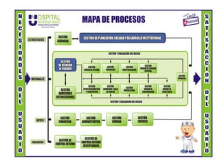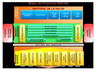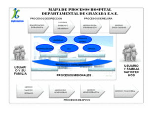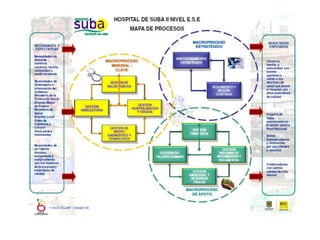 Este documento presenta ejemplos de mapas de procesos aplicados a instituciones del sector salud como ESE Pasto Salud, la Clínica Cartagena del Mar, el Hospital Caicedo en Antioquia, el Hospital San Roque en Pradera Valle del Cauca, el Hospital Universitario del Valle, el Hospital del Sarare y ESE Carmen Emilia Ospina. El ingeniero industrial Edison Alberto Suarez Dominguez ofrece sus servicios como asesor, auditor y consultor empresarial en gerencia de producción, calidad y mapas de procesos
