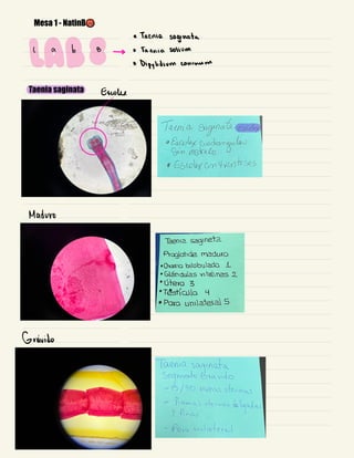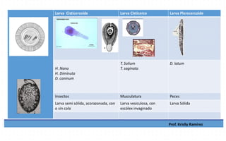 El documento detalla la anatomía y ciclo de vida de tres especies de cestodos: Taenia solium, Taenia saginata y Dipylidium caninum. Se describen los estadios infectantes y diagnósticos, así como los mecanismos de transmisión y las características morfológicas específicas de cada especie. Además, se discuten las implicaciones clínicas de las infecciones causadas por estos parásitos, incluyendo la taeniasis y cisticercosis.