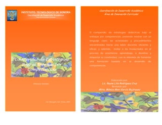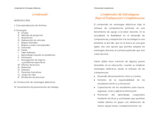 El documento presenta un compendio de estrategias didácticas bajo el enfoque de competencias con el objetivo de apoyar la labor docente. Describe 18 estrategias como ensayos, proyectos, mapas conceptuales, debates y simulaciones. Para cada estrategia define su concepto, cuándo y cómo usarla, los beneficios y recomendaciones. El compendio busca promover un aprendizaje activo mediante actividades que desarrollen pensamiento crítico, trabajo en equipo y comprensión de problemas reales.