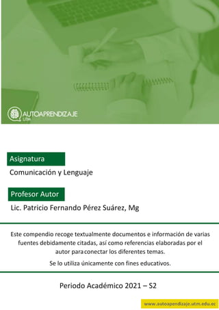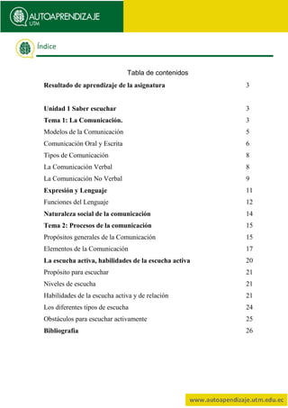 Este documento presenta información sobre la asignatura de Comunicación y Lenguaje. Se divide en dos unidades principales: 1) Saber escuchar y 2) Procesos de comunicación. El objetivo es desarrollar las capacidades comunicativas de los estudiantes a través del análisis de diferentes conceptualizaciones de la comunicación y el desarrollo de habilidades lingüísticas. Se definen y explican conceptos clave como los modelos, tipos y elementos de la comunicación verbal y no verbal.