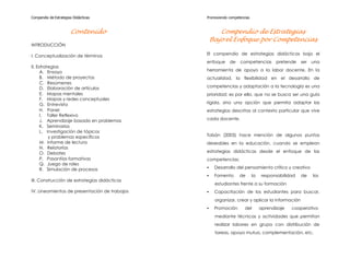 El documento presenta una recopilación de estrategias didácticas bajo el enfoque de competencias, con el objetivo de mostrar actividades y procedimientos que fomenten una enseñanza eficiente y eficaz, así como despertar la creatividad de los involucrados en el proceso de enseñanza-aprendizaje. Se describen diversas estrategias como el ensayo, método de proyectos, resúmenes, entre otras, explicando en qué consisten, cómo implementarlas y los beneficios que ofrecen. El compendio busca ser