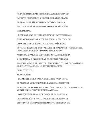 Este documento presenta la política nacional de logística en Colombia, que promueve el desarrollo de un sistema de plataformas logísticas. Propone mejoras en infraestructura, transporte y logística para impulsar el crecimiento económico, como elaborar un plan maestro de infraestructura a largo plazo, desmontar la tabla de fletes, y permitir que plataformas logísticas operen bajo beneficios arancelarios. Colombia tiene rezagos significativos en estas áreas clave para la competitividad.
