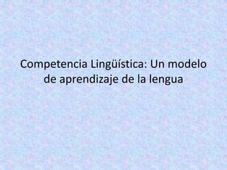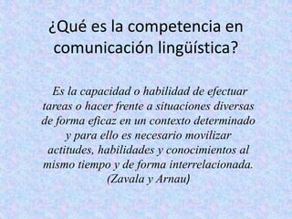 Este documento describe la competencia lingüística y sus componentes. Define la competencia lingüística como la capacidad de realizar tareas efectivamente en diferentes contextos mediante la movilización de actitudes, habilidades y conocimientos de forma interrelacionada. Detalla las ocho competencias basadas en las propuestas de la UE, incluida la competencia lingüística. Explica que la competencia lingüística implica habilidades como la comprensión lectora, la composición de textos escritos y el uso del lenguaje oral.