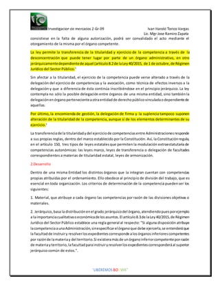 1. El documento define y clasifica los tipos de competencias administrativas. Define la competencia como la habilitación que permite a un órgano o entidad actuar válidamente en una materia. 2. Describe las diferentes formas en que las competencias pueden clasificarse, incluyendo por grado de especificidad, rigidez de la atribución, y si se refieren a entidades u órganos. 3. Explica que las competencias pueden ser exclusivas, compartidas, concurrentes, alternativas, indistintas o sustitutorias dependiendo de las normas