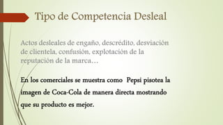 El documento presenta varios ejemplos de prácticas comerciales consideradas desleales por entidades como la Superintendencia de Industria y Comercio de Colombia. Estos incluyen afirmaciones engañosas en comerciales sobre la efectividad de detergentes, acusaciones falsas sobre copias de productos, engaño a clientes para cambiarlos de operador, y nombres de productos que causan confusión con marcas establecidas. En todos los casos, las entidades determinaron que estas prácticas violaban las normas de competencia leal.