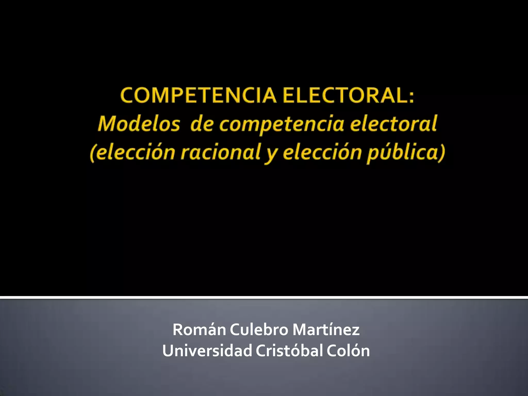 El documento analiza la competencia electoral a través de modelos de elección racional y pública, destacando la analogía entre el mercado y la política. Se argumenta que los individuos actúan en política con motivaciones similares a las del mercado, y que la competencia puede mejorar el control ciudadano sobre el gobierno. La teoría de la elección racional y la teoría de la elección pública se exploran para entender la toma de decisiones políticas y los intereses de diferentes actores en el gobierno.