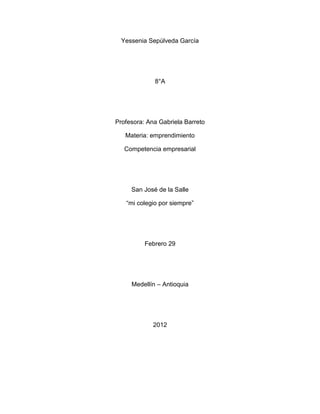 Este documento presenta un resumen de 3 oraciones de un texto sobre competencia empresarial de Yessenia Sepúlveda García de 8° grado. Incluye una lista de 10 elementos valiosos en su casa y sus razones, así como respuestas a preguntas sobre establecer precios, participación de clientes en calidad y mejoramiento continuo.