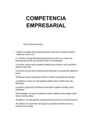 Este documento contiene las respuestas de Yessenia Sepúlveda García a preguntas sobre competencia empresarial. En la primera sección, Yessenia lista 10 elementos valiosos en su casa como el baño, nevera, camas, y explica por qué son valiosos, como para hacer necesidades o refrigerar comida. Luego, describe cómo se establece el precio de un producto sumando el costo real más ganancias. Finalmente, argumenta que los clientes deben participar en el proceso de calidad y explica el significado de mejoramiento continuo en cal