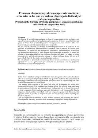 Este documento describe las secuencias didácticas diseñadas para promover el aprendizaje de la competencia escritora en estudiantes universitarios. Las secuencias combinan el trabajo individual y cooperativo. Cada una se centra en un objetivo como la planificación de textos o la revisión. Cada secuencia comienza con una tarea individual y luego los estudiantes trabajan en grupos para integrar sus aportes individuales y producir un texto grupal. El objetivo es que la interacción en los grupos facilite el aprendizaje a través del diálogo