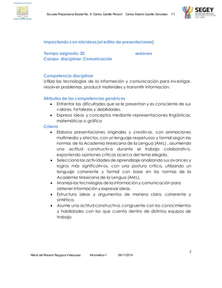 Este documento presenta los objetivos y competencias de un curso de Informática 1 para el alumno Carlos Alberto Castillo González. El curso se enfoca en que los estudiantes utilicen las tecnologías de la información para investigar, resolver problemas y transmitir información de manera creativa y respetuosa. El estudiante debe elaborar presentaciones multimedia originales, expresar ideas con diferentes representaciones y trabajar de manera colaborativa y crítica.