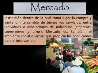 Este documento describe los conceptos de mercado, competencia y tipos de competencia. Define mercado como el lugar donde ocurren las transacciones de bienes y servicios entre individuos o empresas. Explica que la competencia se da cuando al menos dos empresas ofrecen el mismo producto o servicio. Luego describe los tipos de competencia perfecta e imperfecta, señalando que en esta última algunos agentes del mercado pueden influir en los precios. Finalmente concluye que la competitividad de las empresas depende del mercado en el que operan y que actualmente hay una competencia imperfect