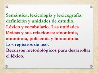 Este documento trata sobre la didáctica del plano léxico-semántico. Explica conceptos como semántica, lexicología y lexicografía, y define sus objetos de estudio. También describe las unidades léxicas y sus relaciones como sinonimia, antonimia, polisemia y homonimia. Por último, ofrece recursos metodológicos para desarrollar el léxico en el aula.