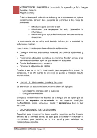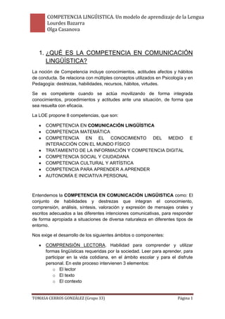 Este documento define la competencia lingüística y sus componentes principales como la comprensión lectora, el uso de la lengua oral, la composición de textos escritos y la competencia plurilingüe. También discute los cambios necesarios en las aulas y centros educativos para desarrollar esta competencia, incluyendo el perfil del profesor y la contribución de los equipos educativos. Finalmente, enfatiza la importancia de crear un proyecto lingüístico de centro para trabajar de forma integral en el desarrollo de la