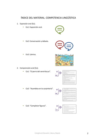 Este documento presenta ejemplos de tareas para evaluar la competencia lingüística en primaria de manera individualizada. Incluye instrumentos para evaluar la expresión oral, comprensión oral, expresión escrita y comprensión escrita. Cada instrumento describe una tarea, pautas de observación y un cuento o texto como ejemplo. El objetivo es recoger observaciones del docente sobre diferentes habilidades lingüísticas del alumno.