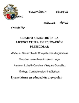 Este documento discute la competencia lingüística y comunicativa desde las perspectivas de Coseriu, Chomsky, Austin y Searle. Explica que la competencia lingüística opera en tres niveles - elocucional, idiomático y expresivo - mientras que la competencia comunicativa implica la producción y recepción del lenguaje como un medio para lograr objetivos. También analiza los actos de habla locutivos, ilocutivos y perlocutivos y la taxonomía de actos ilocutivos propuesta por Searle.