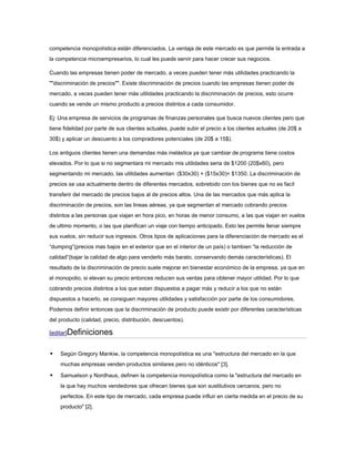 La competencia monopolística se caracteriza por la presencia de múltiples productores que ofrecen productos diferenciados pero sustitutos entre sí. Cada productor tiene cierto poder sobre los precios debido a la diferenciación del producto. Los costos de entrada y salida de la industria son bajos, permitiendo la competencia de microempresas. Un ejemplo es el mercado de ropa para mujeres donde las marcas ofrecen productos diferenciados por calidad, diseño u otros atributos.