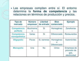 Este documento describe la teoría de los mercados competitivos. Explica las características del mercado competitivo, como la presencia de muchas empresas pequeñas que ofrecen un bien homogéneo y la libertad de entrada y salida del mercado. También analiza cómo las empresas determinan su producción y precios a corto y largo plazo, maximizando sus beneficios en función de los ingresos y costos marginales. Finalmente, explica cómo el equilibrio del mercado se ve afectado por cambios en la demanda u ofertas de las empresas.