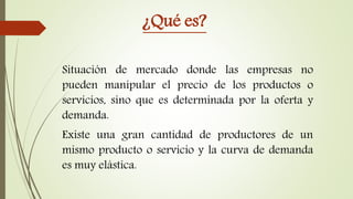 El documento describe la competencia perfecta, una situación de mercado donde muchas empresas ofrecen un producto homogéneo y no pueden manipular el precio. Para que exista competencia perfecta, las empresas deben ser "precio-aceptantes", el producto debe ser poco diferenciable, la información debe ser transparente, y no debe haber barreras de entrada o salida al mercado. El equilibrio de mercado en competencia perfecta se produce cuando la cantidad demandada es igual a la cantidad ofrecida a un precio determinado por la oferta y la demanda.
