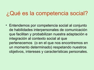 El documento aborda la competencia social como un conjunto de habilidades interpersonales necesarias para la comunicación y adaptación social. Se enfatizan conceptos como la escucha activa, la empatía, la asertividad y las técnicas para facilitar o cortar conversaciones. Además, se detallan los derechos de la persona asertiva y estrategias para recibir críticas de manera efectiva.
