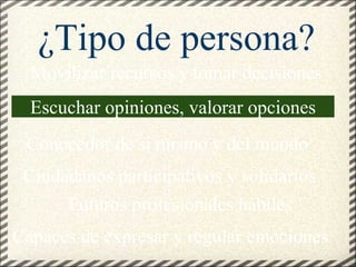 El documento habla sobre las competencias sociales y ciudadanas necesarias para ser personas autónomas, responsables, reflexivas y críticas. Menciona que se debe fomentar la capacidad de los estudiantes para buscar, procesar y comunicar información a través del constructivismo social interactivo y el aprendizaje autónomo sobre temas lingüísticos, matemáticos, culturales y digitales que les permitan participar en la sociedad de forma solidaria. También resalta la importancia de desarrollar competencias transversales a través de situaciones func