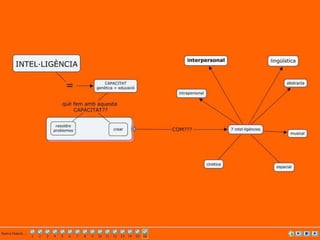 El documento describe las diferentes inteligencias humanas, incluyendo la inteligencia social, lingüística, abstracta, espacial, corporal, musical y natural. También cubre varios tipos de pensamiento como el causal, alternativo, consecuencial, de perspectiva y medios-fin.
