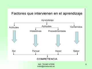 Este documento describe cuatro factores clave que influyen en el proceso de aprendizaje: la actitud, las aptitudes intelectivas, las aptitudes procedimentales y los contenidos. También define competencias como la capacidad de aplicar conocimientos y habilidades en contextos específicos, y discute implicaciones del aprendizaje basado en competencias como cambios en el currículo, las metodologías y la evaluación. El aprendizaje basado en competencias busca formar estudiantes capaces de resolver problemas de manera integral y adaptada a diferentes contextos.