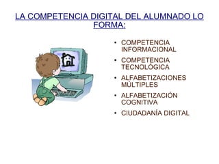 La competencia digital del alumnado se compone de la competencia informacional, la tecnológica y las alfabetizaciones múltiples, así como la cognitiva y la ciudadanía digital. Depende de la competencia digital del profesorado y se complementa con el papel activo de los padres, utilizando estrategias metodológicas activas según los recursos disponibles.
