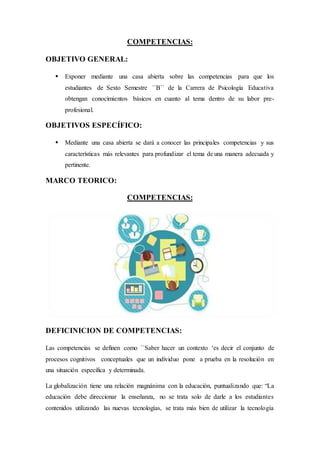 El documento presenta información sobre las competencias y su importancia en el proceso de enseñanza-aprendizaje. Define las competencias como la capacidad de aplicar conocimientos en contexto para resolver situaciones. Describe diferentes tipos de competencias como intelectuales, prácticas e interactivas. Explica que las competencias se caracterizan por ser holísticas, contextuales y evolutivas. Finalmente, concluye que las competencias son vitales para el aprendizaje y que se dividen en categorías y características útiles.