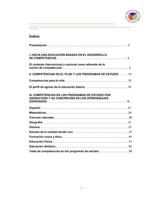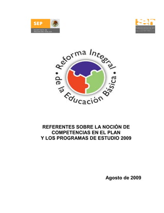 Este documento presenta los referentes internacionales y nacionales sobre el desarrollo de competencias en la educación básica en México. Explica cómo acuerdos como la Conferencia Mundial sobre Educación para Todos y la Comisión Delors promovieron una educación basada en competencias. También describe cómo organismos como la OCDE y el proyecto DeSeCo han identificado competencias clave como comunicación, manejo de herramientas y autonomía. Finalmente, resume cómo estos referentes internacionales se han traducido en la noción de competencias en