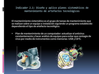 El documento describe un estándar educativo sobre la competencia de apropiación y uso de la tecnología. El estándar incluye cinco indicadores relacionados con el diseño de planes de mantenimiento de artefactos tecnológicos, la investigación de procesos de producción, el uso adecuado de herramientas informáticas, la seguridad en ambientes de trabajo y la interpretación de manuales y diagramas. Uno de los indicadores se enfoca específicamente en el diseño e implementación de planes sistemáticos de mantenimiento de artefactos te