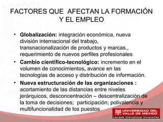 El documento discute los factores que afectan la formación y el empleo, incluida la globalización, el cambio tecnológico y la transformación del contenido del trabajo. También describe los enfoques basados en competencias para la formación profesional, los tipos de competencias, y los principios y métodos para evaluar las competencias.