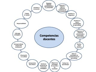 El documento describe las competencias clave de un docente, incluyendo planificar asignaturas y clases, implementar estrategias de enseñanza efectivas, evaluar aprendizajes, liderar proyectos de innovación, y mejorar continuamente a través del autoaprendizaje y trabajo en equipo, todo con el objetivo de ofrecer una educación de calidad y responsabilidad ética.