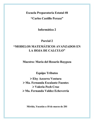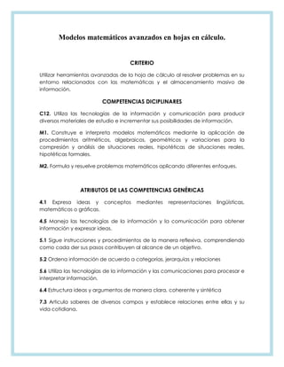 Este documento presenta un examen parcial sobre modelos matemáticos avanzados en hojas de cálculo. Incluye las competencias a evaluar como construir e interpretar modelos matemáticos y resolver problemas matemáticos usando hojas de cálculo. Luego, presenta 5 preguntas de evaluación diagnóstica sobre funciones avanzadas en hojas de cálculo como tablas de datos, formularios, tablas dinámicas y funciones.