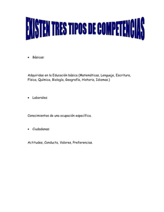 El documento presenta diferentes tipos de competencias y estándares educativos. Brevemente describe las competencias básicas, ciudadanas y laborales. Luego detalla los estándares, logros, indicadores de logro, contenidos, actividades pedagógicas, metodología y material didáctico necesarios para evaluar el aprendizaje de los estudiantes.