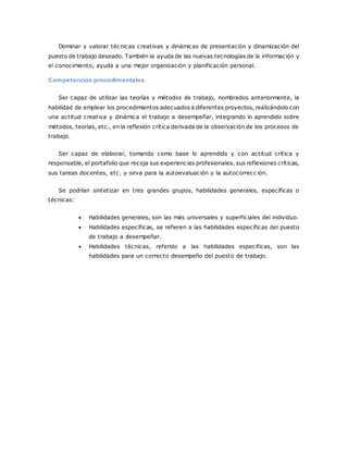 Este documento describe los diferentes tipos de competencias que conforman a un individuo para desempeñar un puesto de trabajo. Se enfoca en las competencias conceptuales, que implican comprender teorías y metodologías relacionadas con el trabajo, y las competencias procedimentales, que involucran la habilidad de aplicar métodos y procedimientos de manera creativa. Finalmente, resume que las competencias pueden clasificarse en tres grupos: habilidades generales, específicas y técnicas.